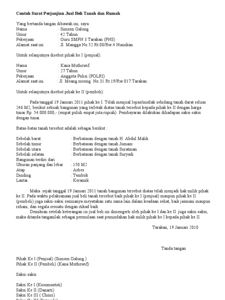 Surat keterangan jual beli tanah ini dibuat tanpa adanya unsur paksaan dari pihak manapun dan kedua belah pihak dalam keadaan sehat jasmani maupun rohaninya. Jika kita memiliki harta benda maka sangat penting bagi kita untuk menjaga dan merawat. Surat jual beli tanah merupakan sebuah surat yang dibuat yang mana isi dari surat tersebut menginformasikan bahwasanya pada tanggal dan waktu tertentu telah dilakukan akad atau transaksi jual beli tanah antara pihak pertama dengan pihak kedua atau juga bisa disebut antara pihak penjual. Menerima semua dokumen berharga, seperti kuitansi pembayaran jual beli tanah tersebut den bukti. Pihak makelar atau agen properti akan memiliki dasar kuat untuk bertindak dan berlaku atas nama anda.